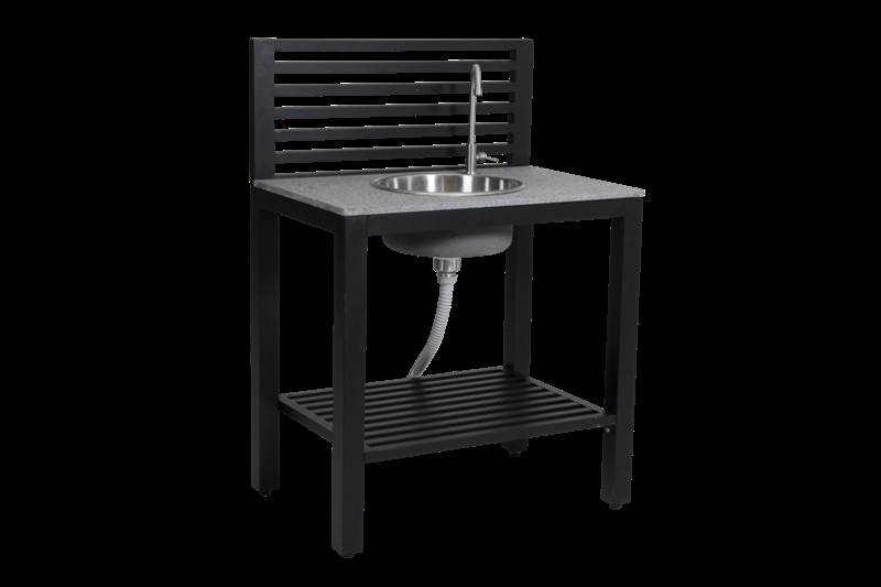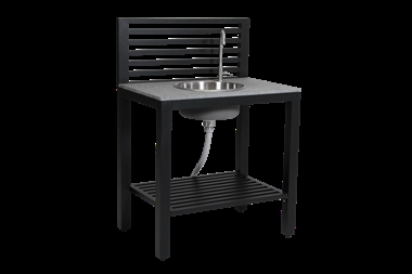 Dette modul er med sort lakeret alu stel og en vask monteret i en stenplade i en lys grå farve. Komplet med armatur og afløb. Under armaturet sidder en kobling til vandslangen.