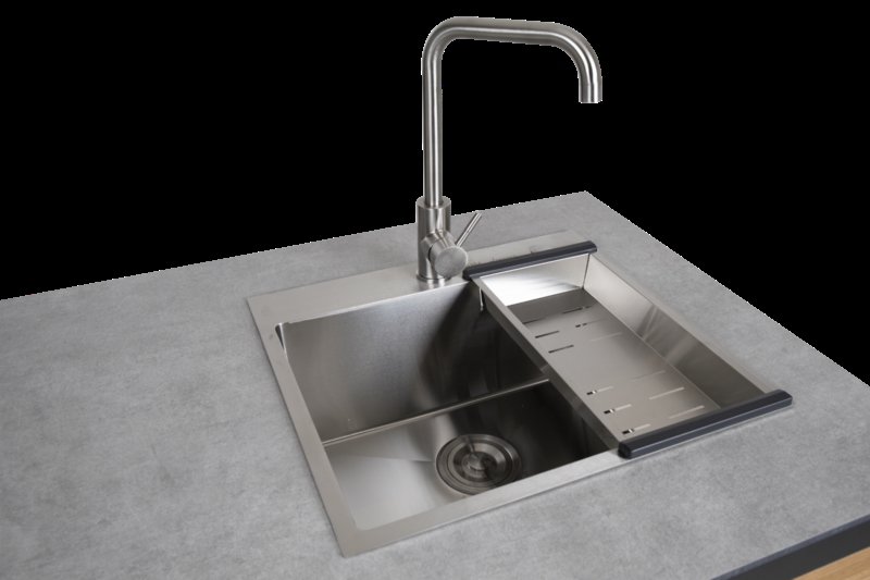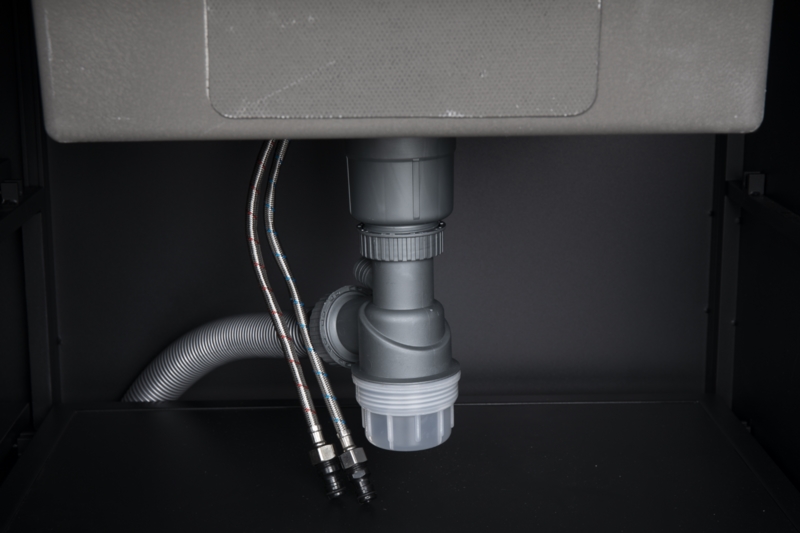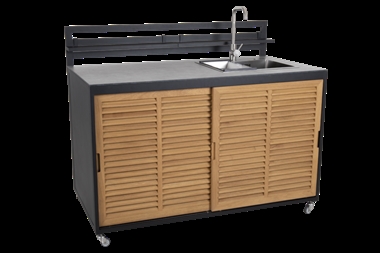 Dette modul er med sort lakeret alu stel og en vask monteret i en højtrykslaminat bordplade i en grå farve. Komplet med armatur og afløb. Under armaturet sidder en kobling til vandslangen. Fronten er forsynet med låger i teak træ.