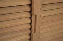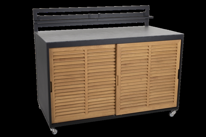 Dette modul er med sort lakeret alu stel med en højtrykslaminat bordplade i en grå farve. Fronten er forsynet med låger i teak træ. Under køkkenmodulet er der nogle solide hjul, så man nemt kan rykke køkkenet rundt.