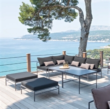 Rivage loungesofaen er produceret i aluminium, som er pulverlakeret. Hynder og stel findes i flere farver.