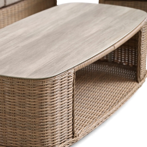Polyrattan er et slidstærkt og vejrbestandigt materiale, som gør loungesættet ideelt til udendørs brug og nemt at vedligeholde. Sofabordet har en stilren bordplade samt en praktisk hylde under, der giver ekstra opbevaringsplads til fx magasiner eller småting.