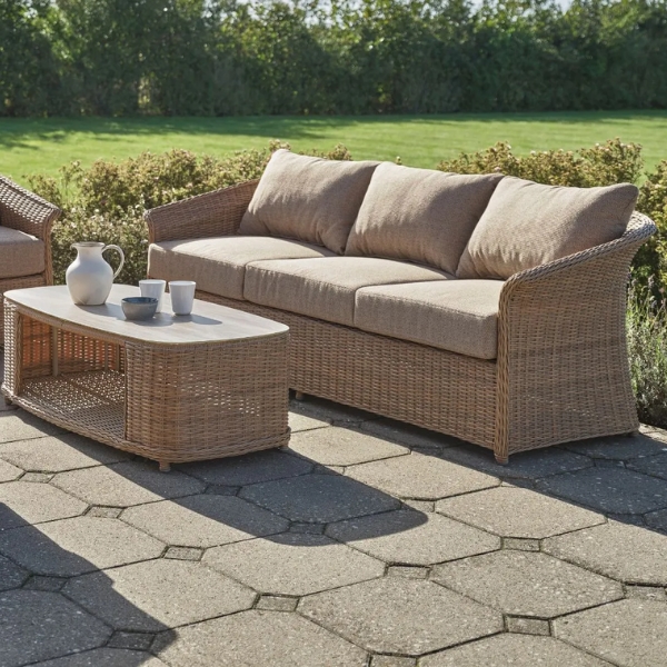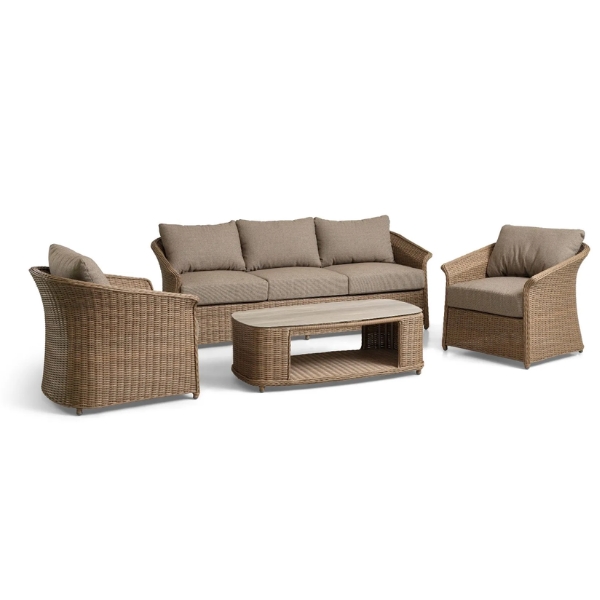 Sættet består af en rummelig 3-personers sofa, to komfortable loungestole og et praktisk sofabord. De bløde hynder i en neutral farve sikrer en behagelig siddekomfort og skaber en afslappet atmosfære, hvor der er plads til lange, hyggelige stunder udendørs.