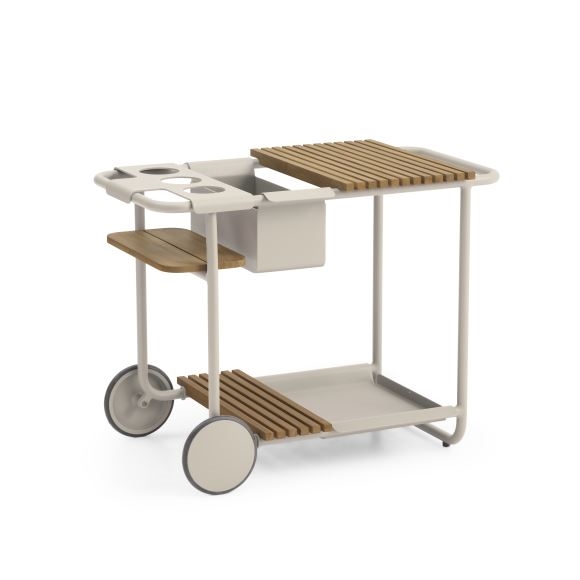 Smuk designet barvogn med 2 store hjul, som gør den nem at flytte. Barvognen er produceret i aluminium og teak.