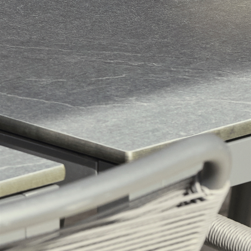 Mandalay Pure havebordet er produceret i pulverlakeret aluminium, med bordplade i kompaktlaminat. Bordpladen er produceret med et skifer look. Minimalistisk design med vedligeholdelsesfrie materialer.