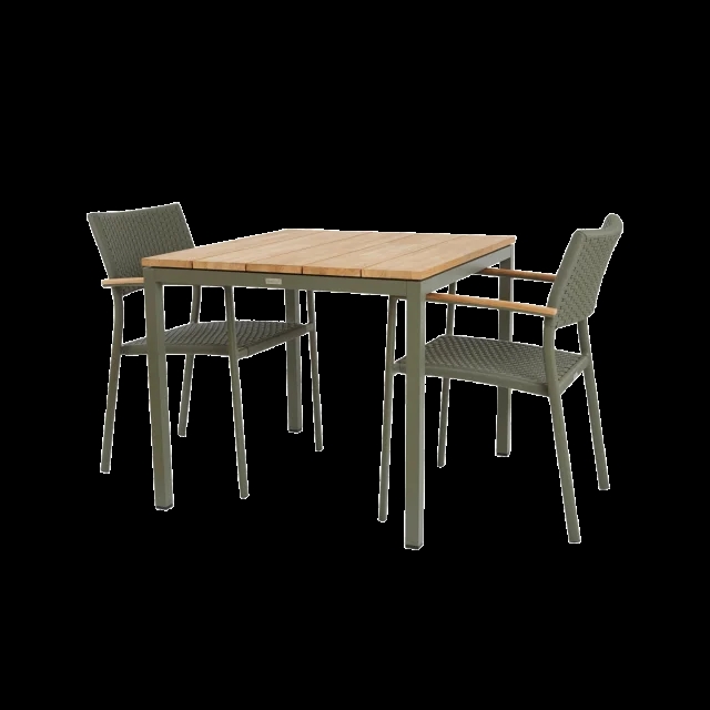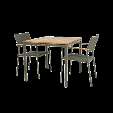 Havemøblerne er fremstillet i pulverlakeret aluminium og teaktræet i indonesisk teak. Havestolen er stabelbar.