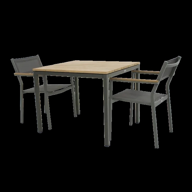 Havemøblerne er fremstillet i pulverlakeret aluminium og teaktræet i indonesisk teak. Havestolen er stabelbar.