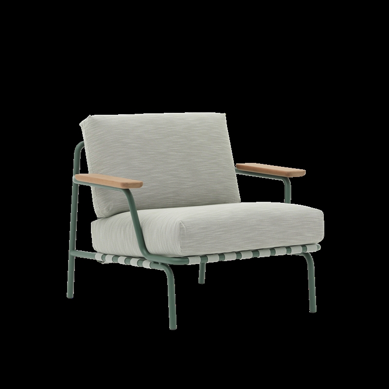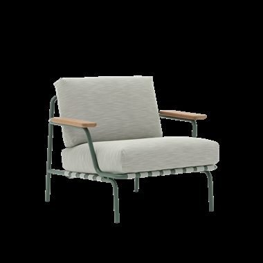 Muuto Settle loungestolen er produceret i galvaniseret stål med armlæn i fsc certificeret mahogni træ. Hynderne er produceret med skumkerne i quick dry skum og slidstærkt møbelstof som kan tåle det danske klima.